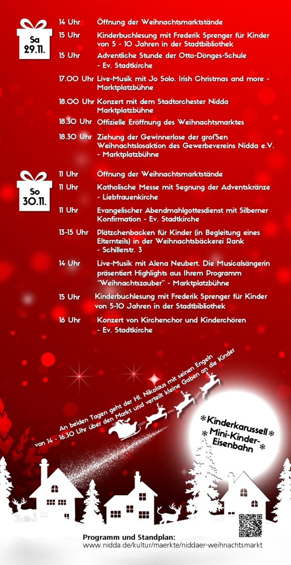 Am 1. Adventswochenende öffnen wieder die weihnachtlich dekorierten Stände mit allerlei Deko, Essens- und Getränkeangeboten in der Niddaer Altstadt. Bereichert wird der Markt durch eine kleine Live-Musik-Bühne, Lebkuchenhaus, Kinderkarussell, Nikolaus mit Engeln, Weihnachtsverlosung des Gewerbevereins und die Schlossweihnacht auf Schloss Nidda.